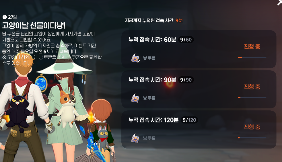 이렇게 누적시간에 따라서 '냥쿠폰'을 하루 최대 4개까지 획득 가능합니다